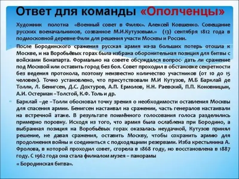 Ответ команды "Ополченцы": Художник полотна "Военный совет в Филях" Алексея Кившенко. Совещание русских военачальников, созванное М.И. Кутузовым. 1 (13) сентября 1812 года в подмосковной деревне Фили для решения участи Москвы и России.