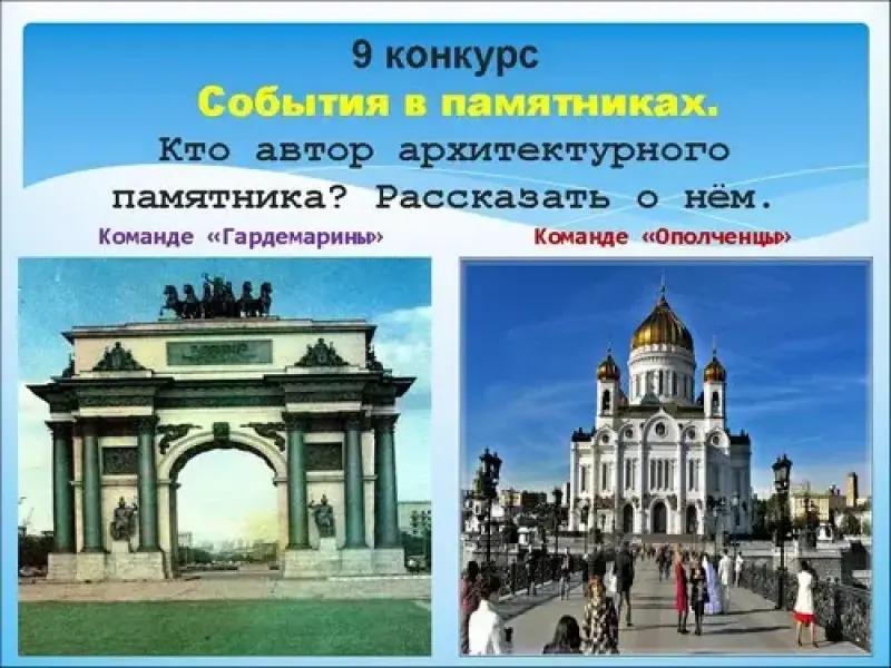 Ответ команды "Гардемарины": Триумфальная арка. Была построена в 1829-1834 гг. (восстановлена в 1968 г.) по проекту архитектора О.И. Бове. Восстановлена в 1968 г. Она повторяла триумфальные постройки Древнего Рима, в стиле ампир, возводилась из кирпича и была облицована белым известняком. Арку высотой 28 м. Венчает арку колесница, запряженная шестеркой лошадей, которой правит крылатая Богиня Победы.