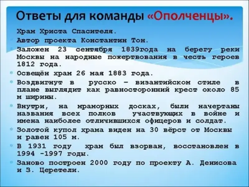 Ответ команды "Ополченцы": Храм Христа Спасителя. Автор проекта Константин Тон. Заложен 23 сентября 1839 на берегу реки Москвы на народные пожертвования этот огромный и величественный памятник героям 1812 года. Освещён храм 26 мая 1883 года. Воздвигнут в русско-византийском стиле в плане выглядит как равносторонний крест около 85 м ширины. Внутри на мраморных досках были начертаны названия всех полков участвовавших в войне и имена наиболее отличившихся офицеров и солдат. Золотой купол храма был виден за 30 верст от Москвы и равен 105 м. В 1931 г. Храм был взорван, восстановлен в 1994-1997 году. Заново построен 2000 году по проекту А.Денисова и З.Церетели.