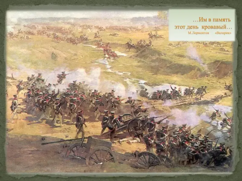 (слайд 2) В истории каждой страны есть даты, которыми она особенно гордится, память о которых чтят поколения людей. Одним из таких незабываемых событий в истории нашей страны является 1812 г., Бородинская битва, которая произошла близ селения Бородино. И всегда находились люди, которые были очевидцами, участниками событий, записывали все, что они видели. С одним из таких людей мы познакомились на прошлом уроке - это Денис Давыдов, который вёл дневниковые записи о войне 1812 г..