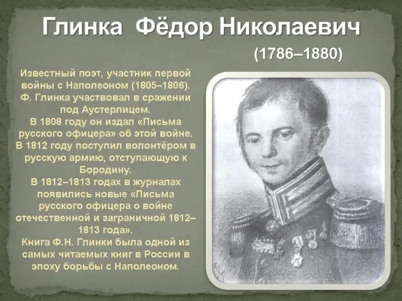(слайд 3) Федор Николаевич Глинка тоже был участником войны 1812 г. Он был автором известной книги «Записки офицера», которые он вел как журналист. Сегодня мы познакомимся с небольшим отрывком из этой книги.