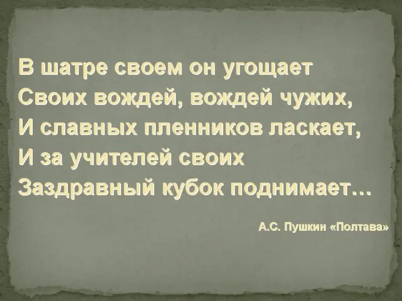 (слайд 26) А.С. Пушкин, описывая Полтавскую битву, писал об уважительном отношении Петра I к врагам: