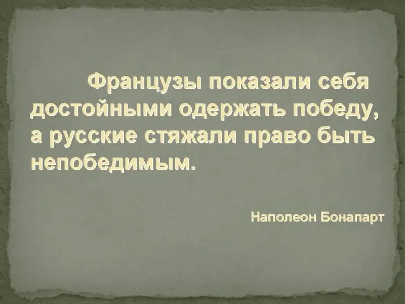 (слайд 27) Сам Наполеон, находясь в заточении на Эльбе, присмиряя потомков участников Бородинского сражения и выказывая уважение к врагам писал: «Французы показали себя достойными одержать победу, а русские стяжали право быть непобедимыми».
