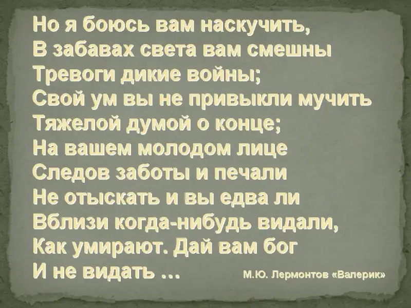 (слайд 29) Закончить урок хотелось бы строками из стихотворения М.Ю. Лермонтова «Валерик»: