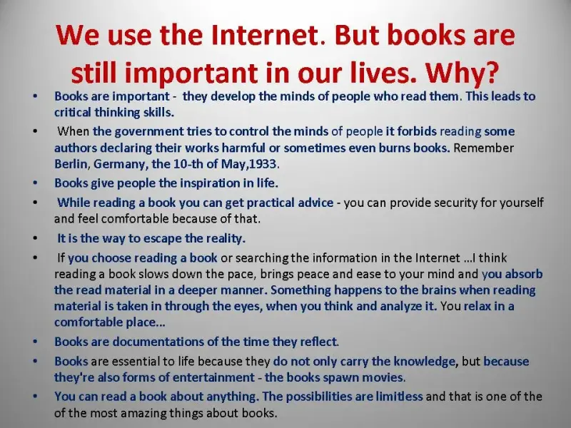 Teacher: Very often when we need the information we use the Internet. Do you think the books are still important in our lives and why, if you think so.