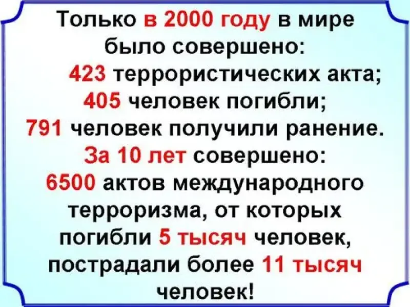 - За десять лет совершено 6500 актов международного терроризма, от которых погибли 5 тысяч человек, пострадали более 11 тысяч человек!