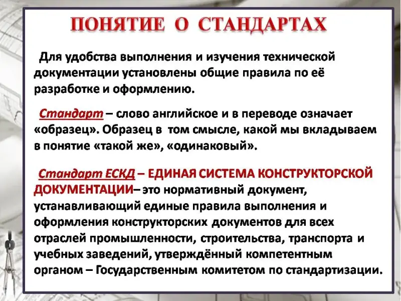 Каждый чертёжный документ выполняется по единым правилам - стандартам. В нашей стране приняты и действуют государственные стандарты Единой конструкторской документации - ЕСКД. Что же такое стандарт? (Слайды 5, 6)