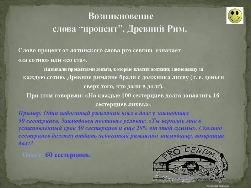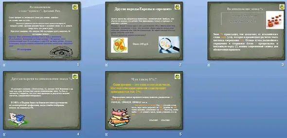 Презентация об истории возникновения процентов. 3 мин. - Актуализация опорных знаний и умений учащихся. 2 мин.