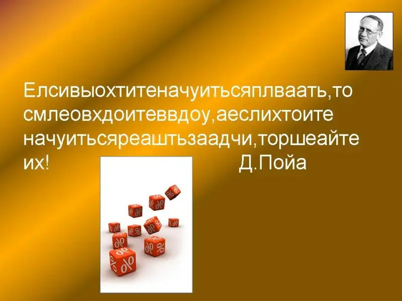 Сообщается тема урока Слайд 1 (учащиеся записывают дату в тетради) и эпиграф Слайд 2. Сегодня мы с вами заканчиваем изучать тему: «Проценты». А эпиграфом урока будут слова математика и педагога Джорджа Пойа(1887-1985) - Елсивыохтитеначуитьсяплваать,то смлеовхдоитеввдоу,аеслихтоитеначуитьсяреаштьзаадчи,торшеайтеих.