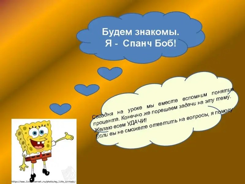 Ставится задача:Сегодня на уроке мы вместе вспомним понятие процента. Конечно же, решим задачи на эту тему. Нам в этом поможет мультигерой. Слайд 4 Узнали?
