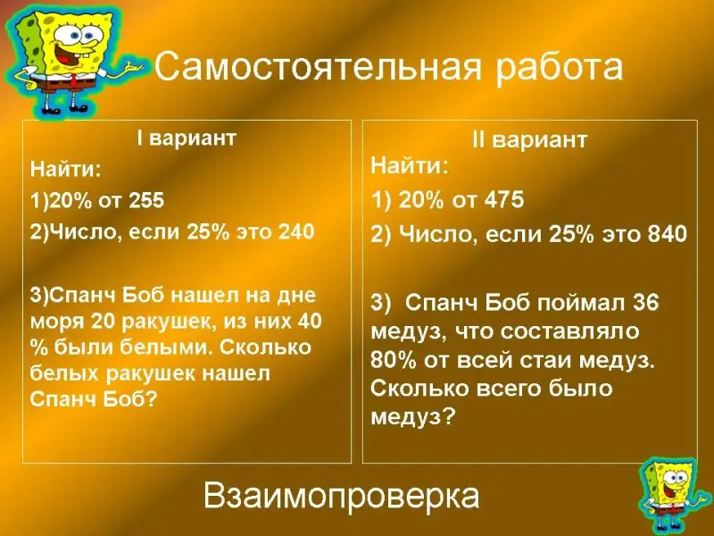 а) Спанч Боб получил 6000 руб. 60% заплатил за медуз. Сколько рублей он заплатил? Сколько рублей у Боба осталось?
