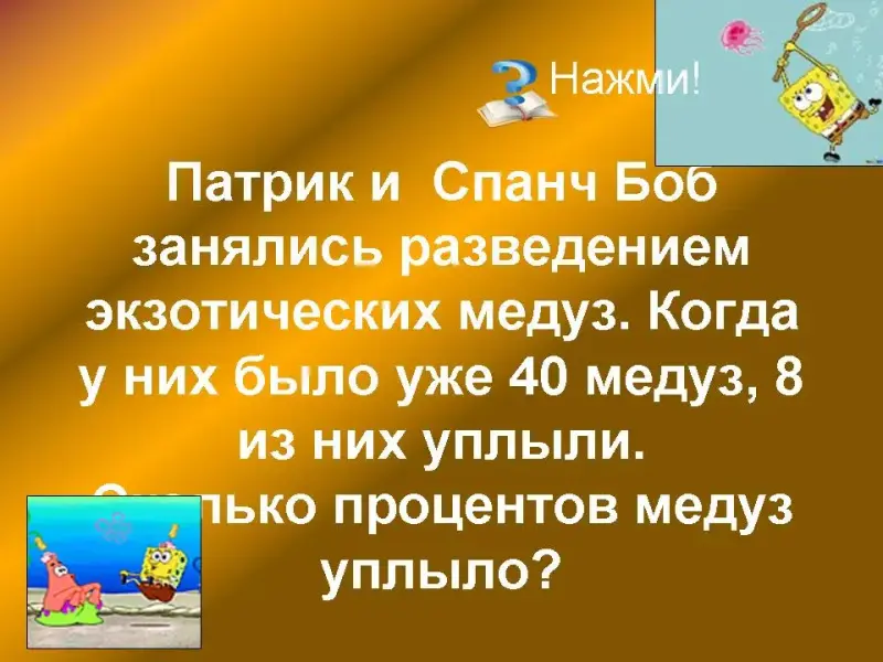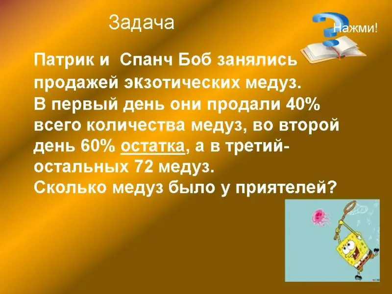 на процентное отношение. Слайды 11-12 (подсказки по гиперссылке «Нажми»)