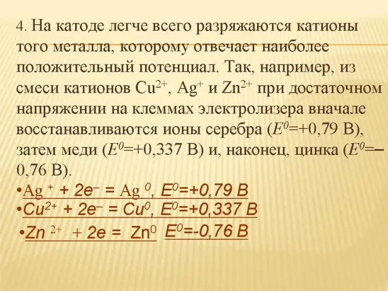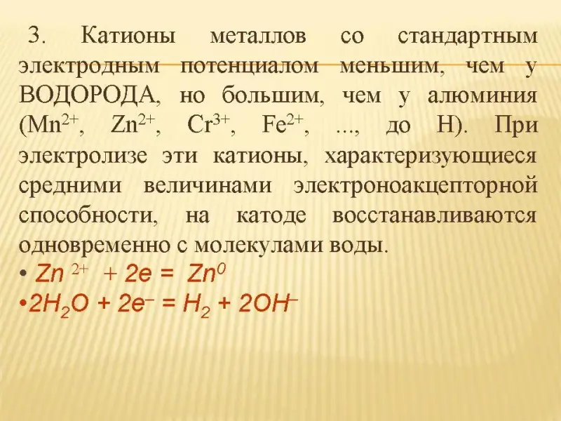 1. Катионы, расположенные в ряду напряжений металлов от лития до алюминия (включительно), а также катионы NН4+ не восстанавливаются, вместо них восстанавливаются молекулы воды: