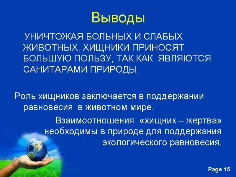 Выводы. Слайд 15. Уничтожая больных и слабых животных, хищники приносят большую пользу, так как являются санитарами природы. Роль хищников заключается в поддержании равновесия в животном мире. Взаимоотношения "хищник - жертва" необходимы в природе для поддержания экологического равновесия.