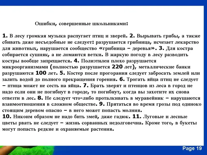 1. В лесу громкая музыка распугает птиц и зверей. 2. Вырывать грибы, а также сбивать даже несъедобные не следует: разрушается грибница, исчезает лекарство для животных, нарушается сообщество "грибница - деревья". 3. Для костра собирается сушняк, а не ломаются ветки. В жаркую погоду в лесу разводить костры вообще запрещается. 4. Полиэтилен плохо разрушается микроорганизмами (полностью разрушается 220 лет), металлические банки разрушаются 100 лет. 5. Костер после прогорания следует забросать землей или залить водой до полного прекращения горения. 6. Трогать яйца птиц не следует - птица может не сесть на яйца. 7. Брать зверят и птенцов из леса в город не надо если они не погибнут в городе, то погибнут, когда вы захотите их снова отвезти в лес. 8. Не следует что-либо проталкивать в муравейник - нарушаются взаимоотношения в сложном обществе. 9. Прятаться во время грозы под одиноко стоящим деревом опасно - в него может попасть молния.