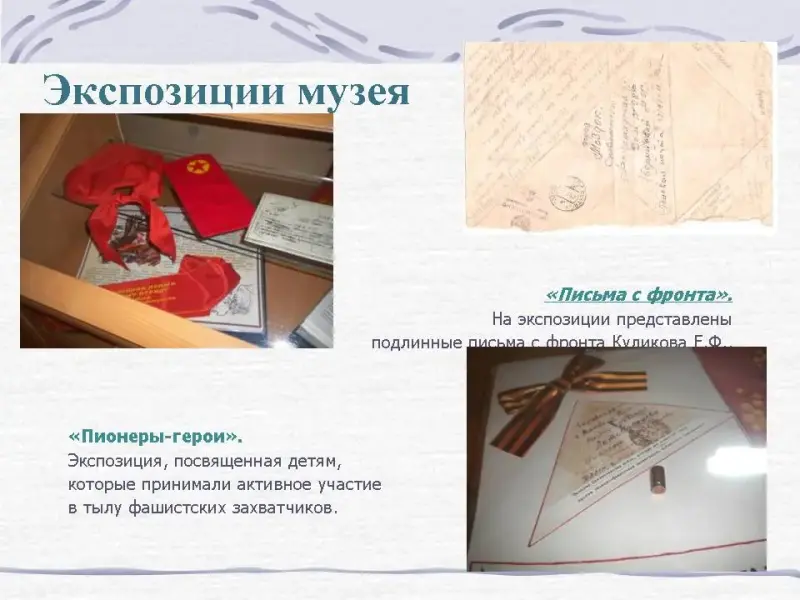 Работа ведется параллельно по всем направлениям военно-исторического музея. Систематически обеспечивалась фотосъемка, отражающая встречи учащихся школы с героями событий военной истории и героической славы. Регулярно проводилась просветительская работа среди учащихся школы с целью приобретения музейных предметов, принадлежащих старшему поколению в семьях детей, ветераны, посещающие школу, также дарили музею личные вещи, письма, за счет чего значительно пополнились музейные фонды. Это позволило расширить экспозицию и тематику экскурсионной работы музея.