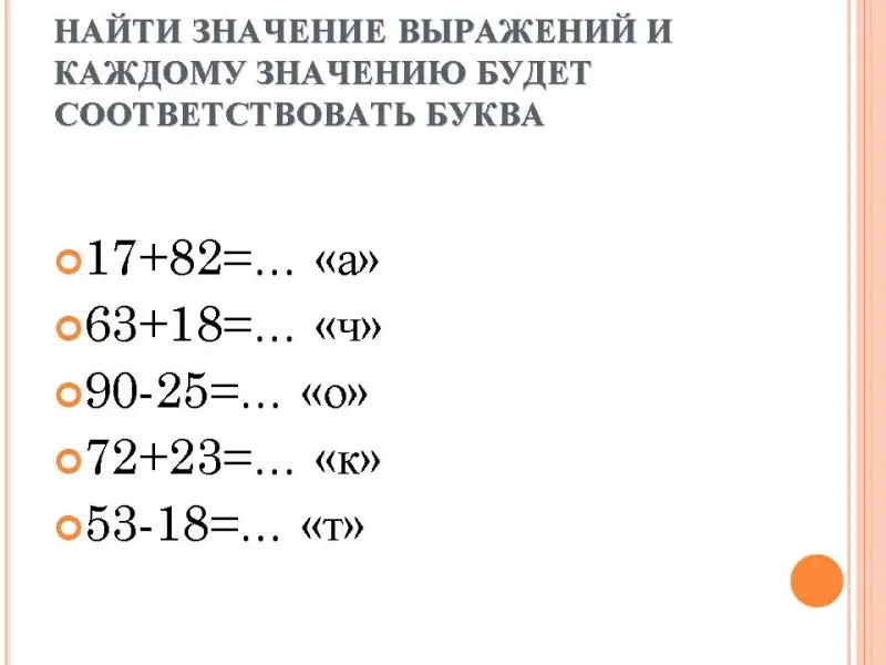 - Значит в имени нашей гостьи тоже 5 букв. А теперь давайте его разгадаем. Но для того узнать имя нашей гостьи, нужно найти значение выражений и каждому значению будет соответствовать буква. Слайд 3