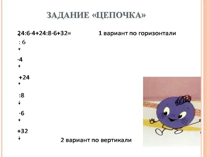 Задание записано на доске и у каждого из вас на парте лежат карточки, с таким же заданием. На карточке так же записан номер вашего варианта. Два человека работают у доски. Вам нужно будет решать выражения, записывая только ответы. Посмотрим, кто первый доберется до вершины. А остальные ребята работают в тетрадях, записывая только ответы в строчку через клеточку.