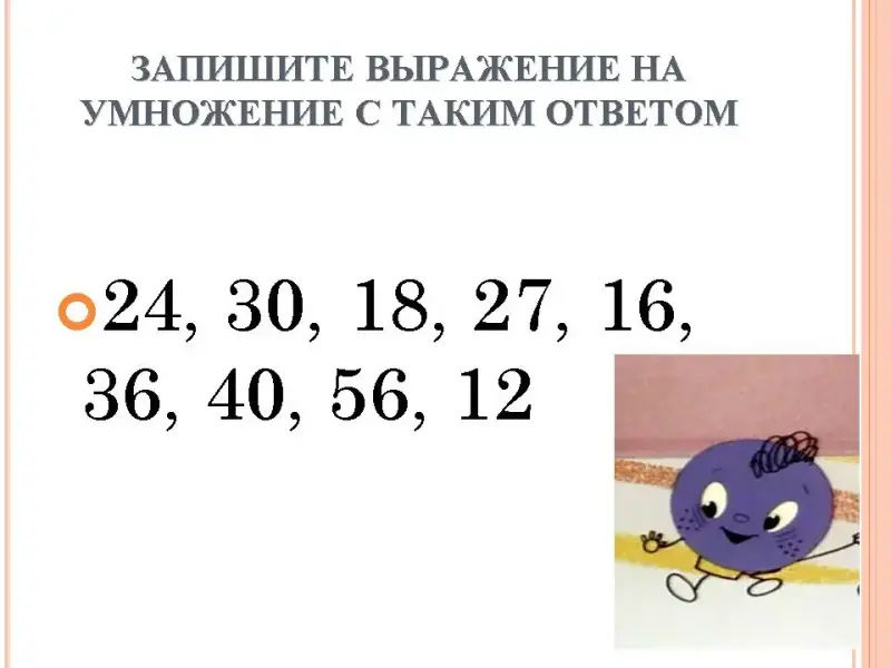 - Перед вами записаны числа, а вы должны записать выражения на умножение с такими ответами (3 столбика по 3 выражения). Слайд 8