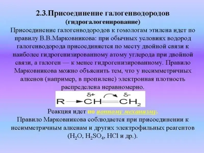 | Реакция гидрогалогенирования. Правило Марковникова (объяснение учителя) |