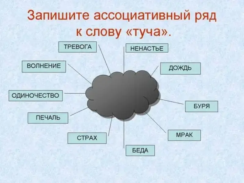 Запишите ассоциативный ряд к слову "туча". (Ненастье, дождь, буря, страх, беда, мрак, печаль, одиночество, волнение, тревога и т.д.)