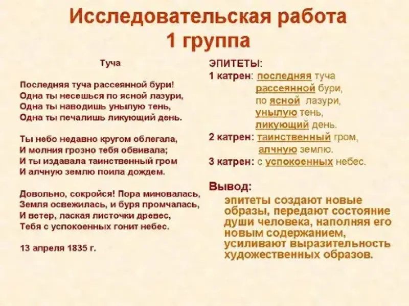 - На столах лежат тексты стихотворения А.С. Пушкина "Туча", справочные материалы, задания, которые вам предстоит выполнить в процессе групповой работы и в парах.