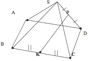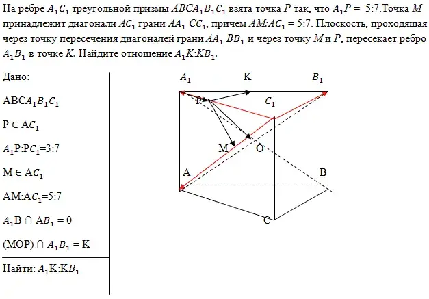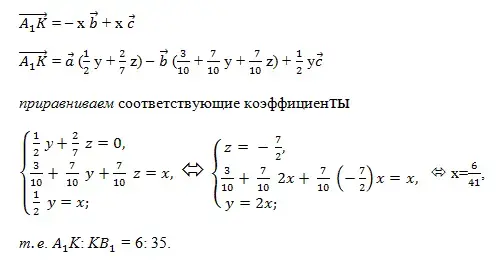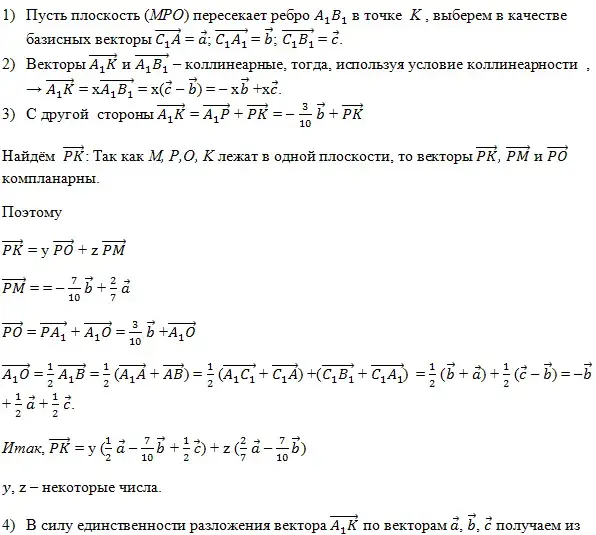 Задачи об отношениях отрезков это тип задач, в которых требуется определить, в каком отношении данная плоскость делит какой - либо отрезок. Плоскость является секущей плоскостью некоторого многогранника, а отрезком служит одно из рёбер этого многогранника. При решении подобных задач следует выбрать тройку базисных векторов (обычно связанных с многогранником, например, выходящих из какой - либо его вершины). Затем необходимо ввести подлежащие определению неизвестные: их в большинстве случаев три, - одно позволяет найти искомое отношение, а два других - коэффициенты в условии компланарности некоторых трёх векторов, принадлежащих данной плоскости. После этого, получив двумя способами разложение какого - либо вектора по базисным, нужно, используя единственность разложения приравнять коэффициенты в разложениях и получить три уравнения с тремя введёнными неизвестными.