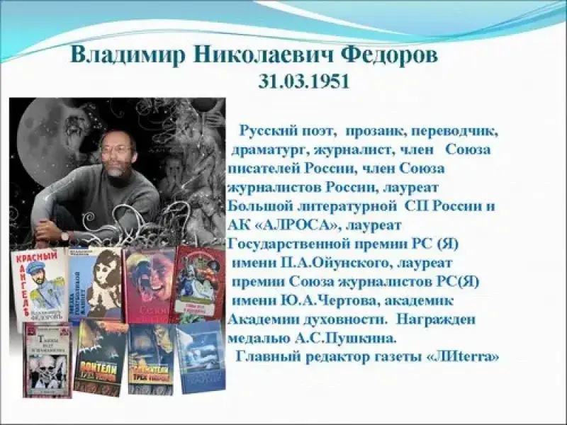 Владимир Федоров - русский поэт, прозаик, переводчик, драматург, журналист, член Союза писателей СССР с 1988 года, лауреат премии имени П.А.Ойунского, академик Академии духовности Владимир Николаевич Федоров родился 31 марта 1951 года в рыбацком поселке Таас Тумус Кобяйского района Якутской АССР. Окончил среднюю школу в поселке Сангар.