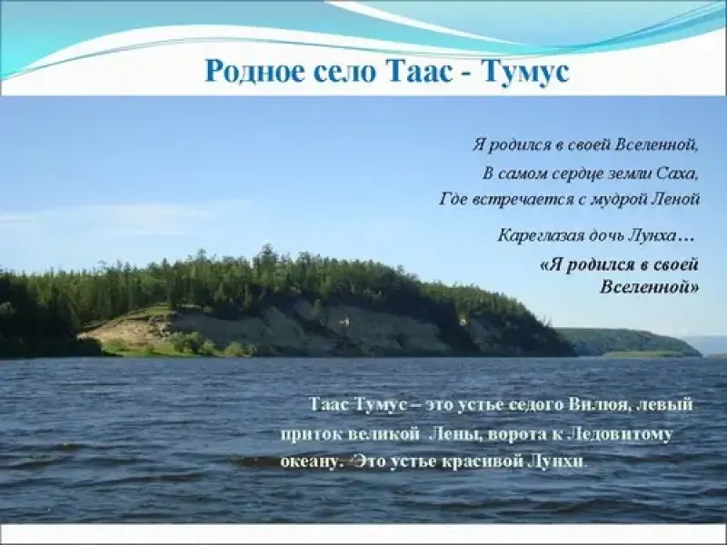 Таас Тумус - это устье седого Вилюя, левый приток великой Лены, ворота к Ледовитому океану. Это устье красивой Лунхи. Вот здесь и родился Владимир Николаевич Федоров. Он рос среди рыбаков и охотников. Самое первое воспоминание из детства у писателя - ледоход, ловля рыбы, охота. В десять лет ему подарили ружье, в десять он один ездил на моторной лодке проверять сети. И почти в то же время научился фотографировать: подарили фотоаппарат. Это занятие помогло в работе Владимира Федорова как геолога и журналиста.