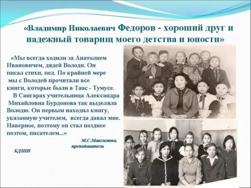 Владимира Николаевича Федорова, родилась в Таас Тумусе. Вместе росли, выросли, за годы учебы в школе сидели за одной партой. От бабушки я узнала о рыбацком поселке Таас Тумус, ездила с бабушкой и дедушкой в этот поселок в 2008 году. Бабушка показала место, где стоял ее родной дом, рассказала о поселке. Сейчас в бывшем поселке рыбаков остался только один дом. Это дом, где родился писатель Владимир Николаевич Федоров.