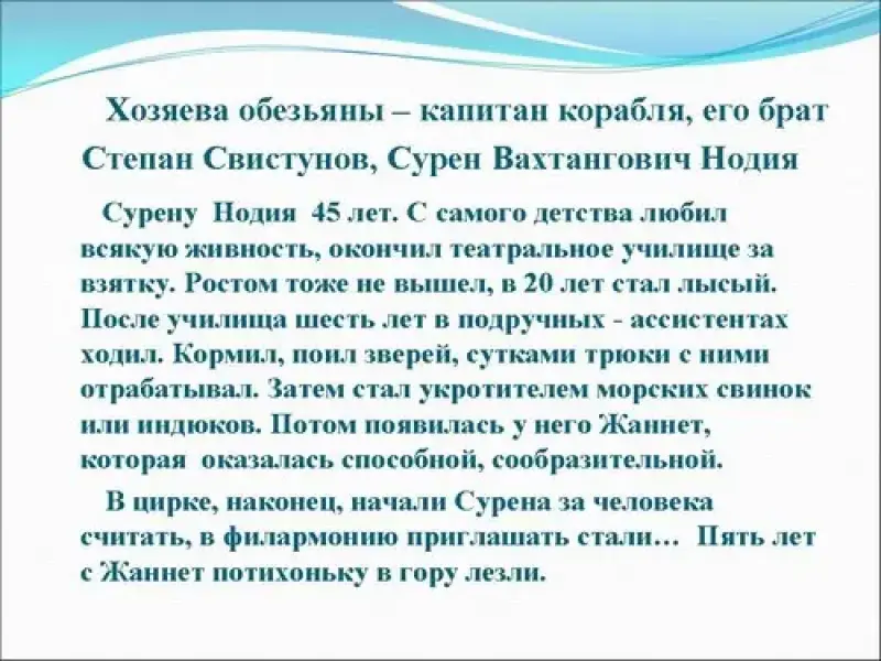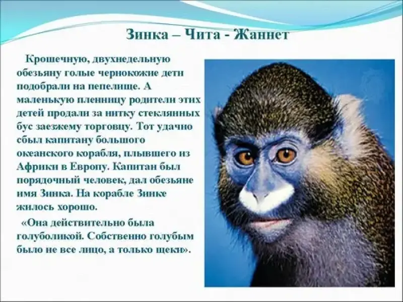 Работа по раскрытию содержания повести, где главной героиней является экзотическая обезьяна с красивым именем Жаннет. (Заранее учащимся дано задание: прочитать повесть)
