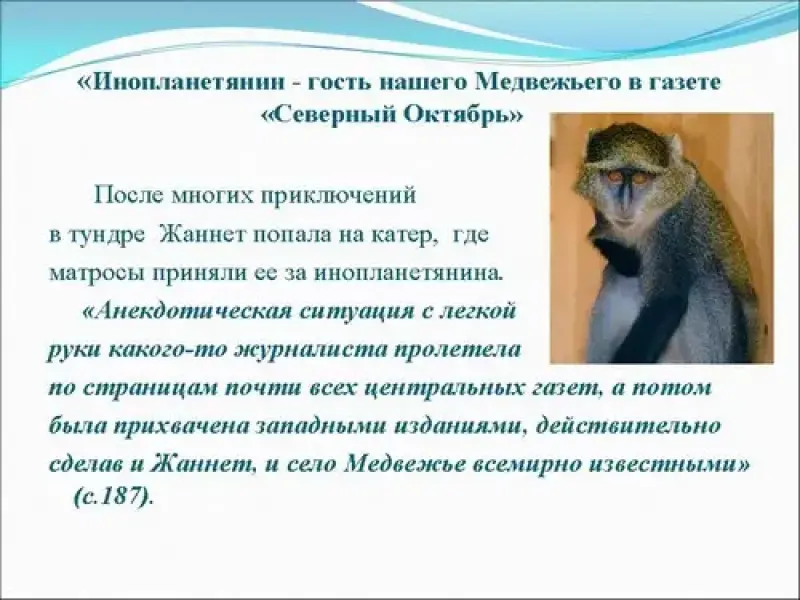 Чтение описания эпикировки обезьяны: "По официальному письму Ивана Емельяновича в театральной мастерской ей сшили комбинезон, унты, рукавички, шапку из обрезков песцовой шкуры и даже шерстяную маску чулок с прорезью только глаз - на случай особых холодов. В этом Жаннет выглядела заправской северянкой и по случаю, в тумане или в сумерках, вполне могла быть принята за малышку, доставленную на руках заботливым папой-кавказцем в детский сад" (с.130). Оленеводы подыскали для Жаннет детскую люльку из шкур на оленьей нарте, чтобы она ездила в ней во время гастролей.