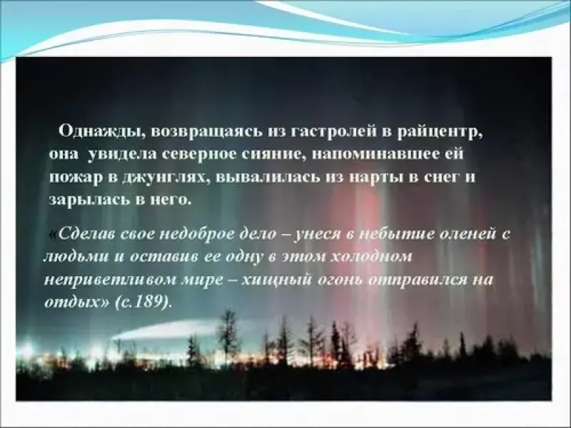 - зима. Северное сияние "Сделав свое недоброе дело - унеся в небытие оленей с людьми и оставив ее одну в этом холодном неприветливом мире - хищный огонь отправился на отдых" (с.189).
