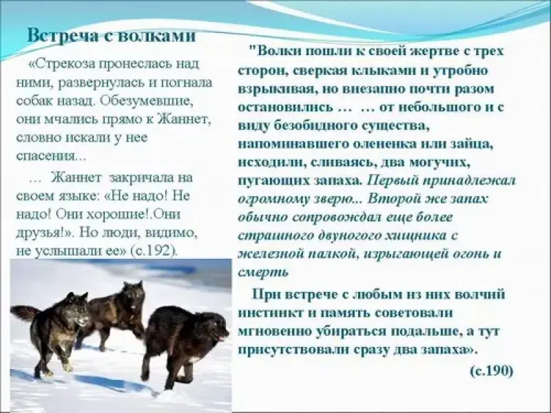 - встреча с волками. "Волки пошли к своей жертве с трех сторон, сверкая клыками и утробно взрыкивая, но внезапно почти разом остановились и нерешительно затоптались на месте. Дело в том, что от небольшого и с виду безобидного существа, напоминавшего олененка или зайца, исходили, сливаясь, два могучих, пугающих запаха. Первый принадлежал огромному зверю... Второй же запах обычно сопровождал еще более страшного двуногого хищника с железной палкой, изрыгающей огонь и смерть. При встрече с любым из них волчий инстинкт и память советовали мгновенно убираться подальше, а тут присутствовали сразу два запаха" (с.190).