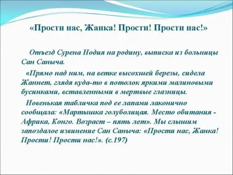 VI. Заключение. Итак, познакомились с судьбой маленькой обезьянки с голубыми щечками по имени Жаннет. Смерть Жаннет заставляет задуматься над причинами ее смерти. Родители Жаннет погибли во время пожара, а ее спасли. Не будь пожар в джунглях, она бы осталась жива. Судьба сироты зависела от людей, ее приютивших. Но кем были для нее люди? Спасителями или губителями? Маленькая, смешная Жаннет погибла, потому что она оказалась ненужной им. В ее смерти виноваты люди.
