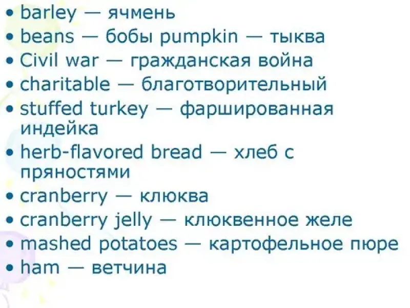 P 4: [СЛАЙД 5] The American Thanksgiving began as a feast of thanksgiving for rich harvest almost four hundred years ago. In 1620, a group of people sailed across the Atlantic Ocean to settle in the New World. Their first winter in America was difficult. They arrived too late to grow a rich harvest. Only the following spring the Indians taught them how to grow corn and other crops and how to hunt and fish. In the autumn of 1621 they got a bountiful harvest of corn, [СЛАЙД 6] barley, beans and pumpkins. The colonists planned a feast. The colonists learned from Indians how to cook cranberries and dishes of corn and pumpkins.