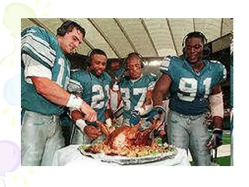 Mathew: [СЛАЙД 16] There is a church service normally in the morning. My mother will, actually, prepare the turkey and my sisters will help her. And so people begin to arrive at about ... eleven o'clock or twelve o'clock noon to my parents' home. And everyone gathers together and normally, for us in Detroit, [СЛАЙД 17] there's a big football game that day. 'The Detroit Lions', the football team, plays every Thanksgiving. And it's always on television. So, we will watch the game on television.
