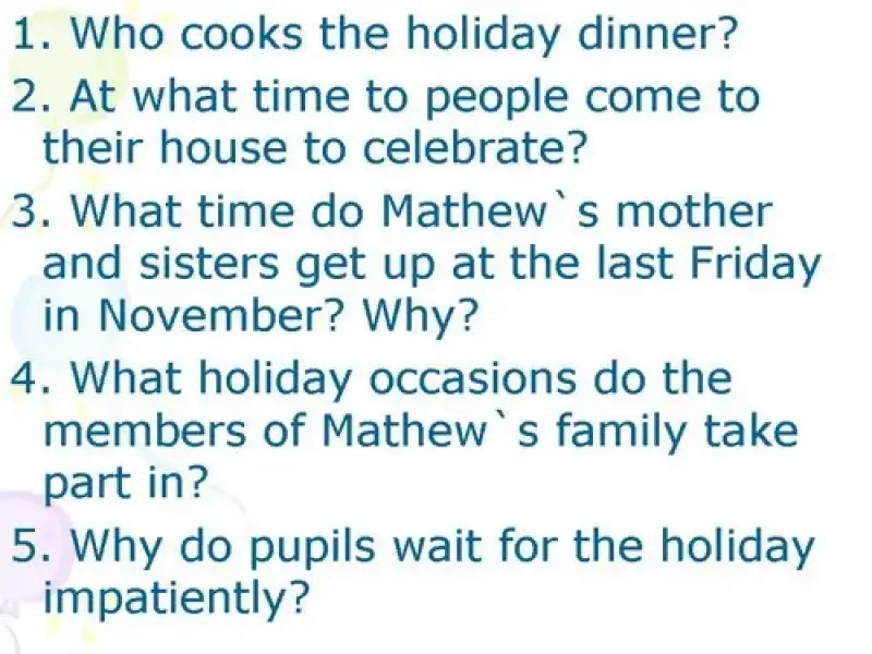 P 2: So, let`s see how careful you were. Who can tell us how Thanksgiving is celebrated in Mathew`s family? [СЛАЙД 19]