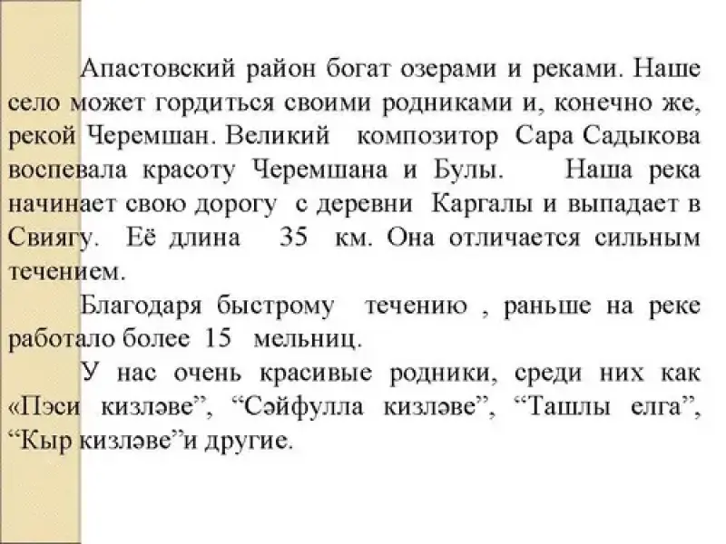 Апастовский район богат озерами и реками. Наше село может гордиться своими родниками и, конечно же, рекой Черемшан. Великий композитор Сара Садыкова воспевала красоту Черемшана и Булы. Наша