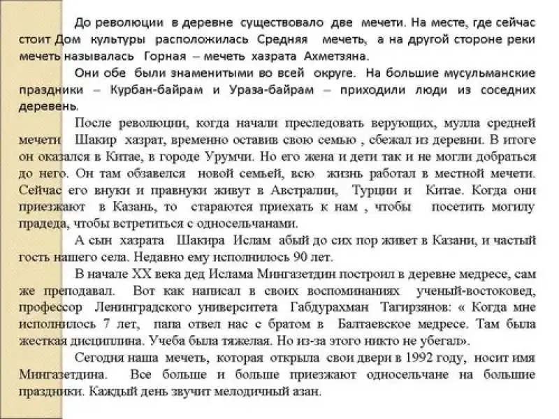 Сегодня наша мечеть, которая открыла свои двери в 1992 году, носит имя Мингазетдина. Все больше и больше приезжают односельчане на большие праздники. Каждый день звучит мелодичный азан.