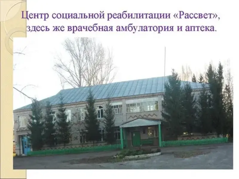 Центр социальной реабилитации «Рассвет», здесь же врачебная амбулатория и аптека.