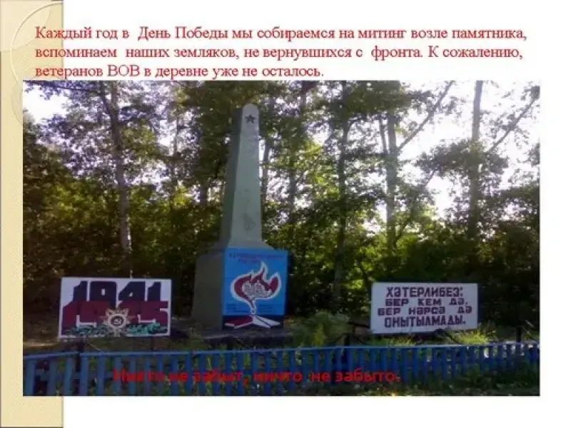 Каждый год в День Победы мы собираемся на митинг возле памятника, вспоминаем наших земляков, не вернувшихся с фронта. К сожалению, ветеранов ВОВ в деревне уже не осталось.
