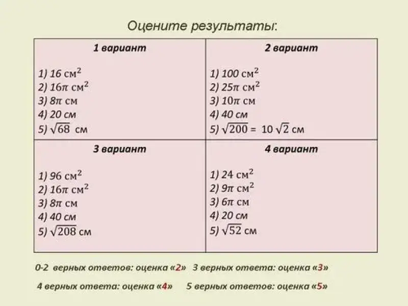 (Работа на 4 варианта с последующей проверкой результатов (слайд №8). Возможный вариант применения: обучающиеся, сидящие рядом или по диагонали, меняются работами с соседями, проверяют работы и сообщают оценку.)
