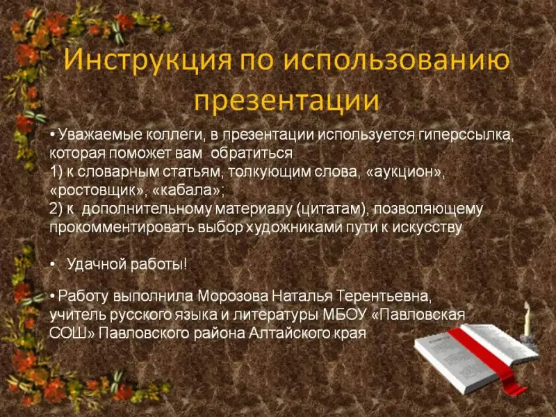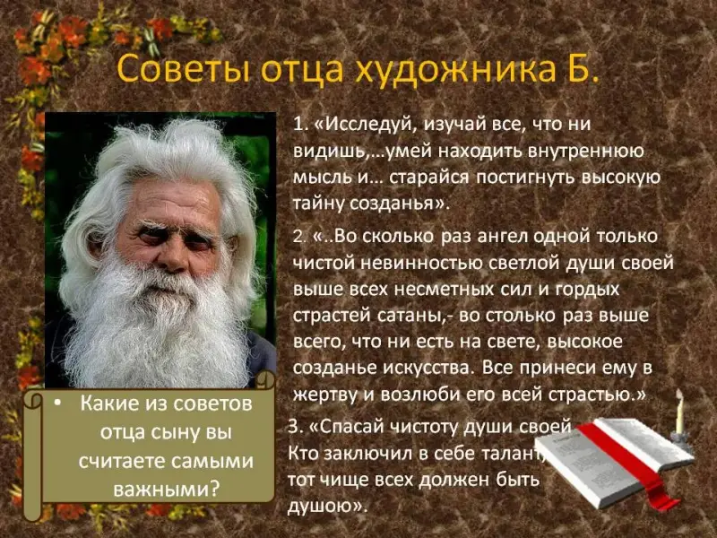 Сообщение 3 микрогруппы (домашнее задание по теме «Советы и наставления отца художника Б. своему сыну») (Слайд №14)