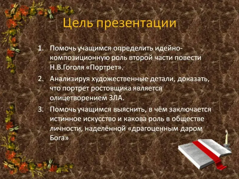 - выяснить, какова идейно-композиционная роль второй части повести «Портрет» и как автор решает проблему истинного искусства.