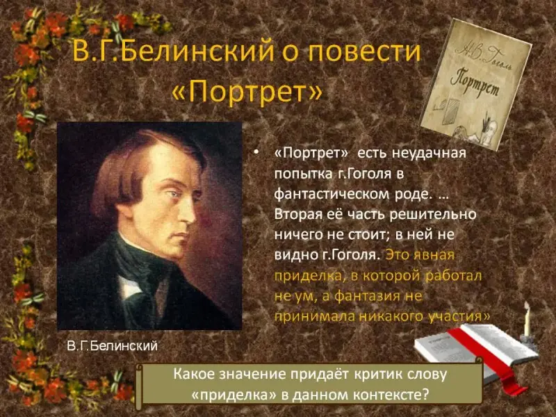читателей и критиков, но каково же было разочарование писателя, когда В. Г. Белинский неодобрительно отозвался о повести: (Слайд №5) "Портрет есть неудачная попытка г.