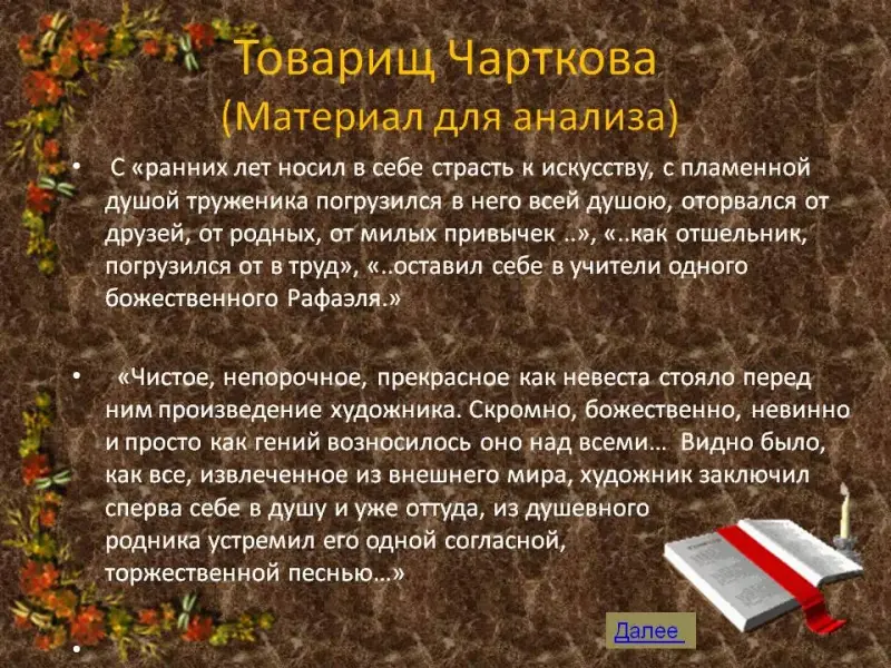 - Художник Андрей Петрович Чартков (1 группа) (Цитаты в помощь отвечающим - гиперссылка: слайд № 19)