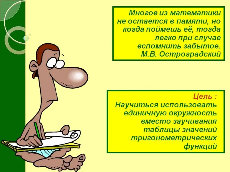 Цель: научить использовать единичную окружность при решении различных тригонометрических заданий.
