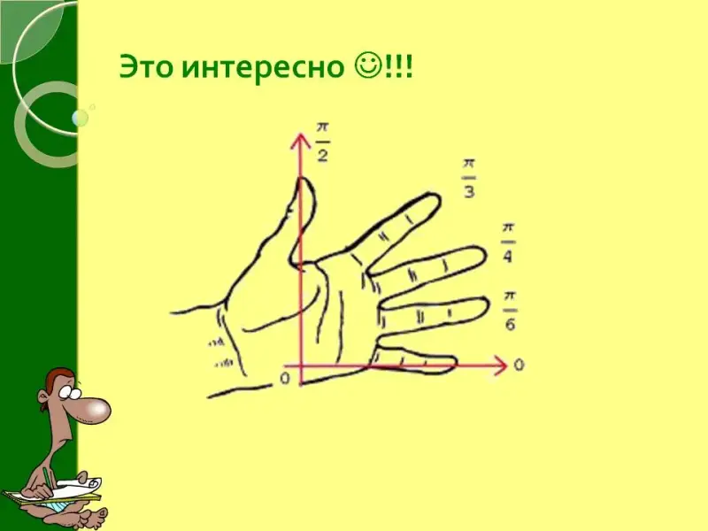 - нахождения значений тригонометрических функций для некоторых значений числового и углового аргумента;