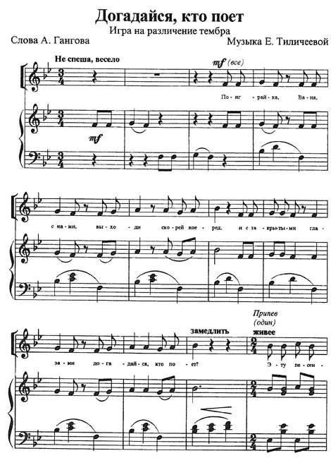 - Даже если они умышленно изменят свой голос, мы всё равно узнаем его. Чтобы подтвердить это, я предлагаю вам поиграть в игру. (Разучивается и исполняется песня-игра «Догадайся, кто поёт»: дети по